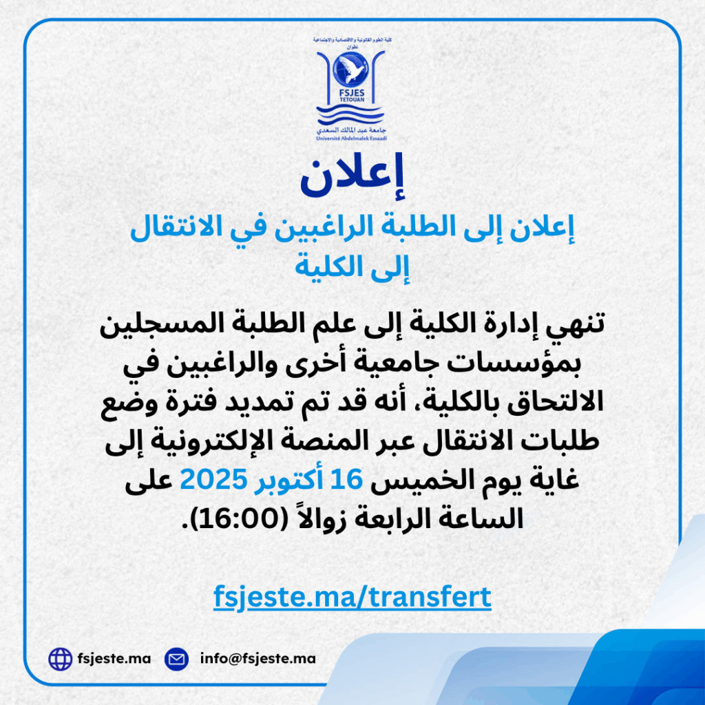 إعلان إلى الطلبة الراغبين في الانتقال إلى الكلية