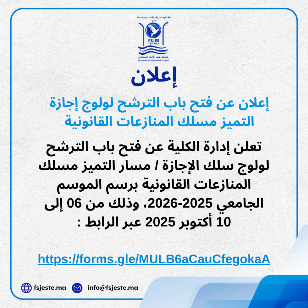 إعلان عن فتح باب الترشح لولوج إجازة التميز مسلك المنازعات القانونية