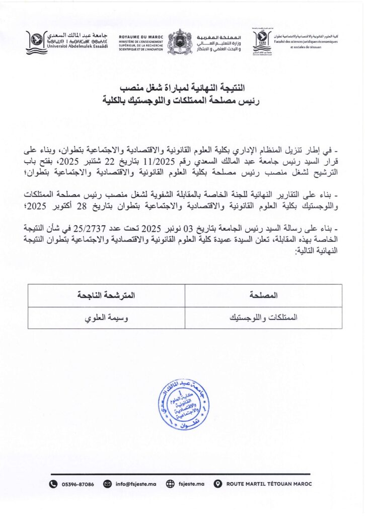 النتيجة النهائية لمباراة شغل منصب رئيس مصلحة الممتلكات واللوجستيك