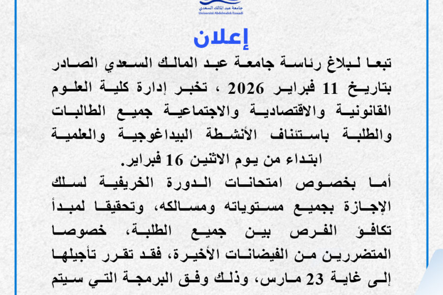 ACTUALITÉS إعلان عن استئناف الأنشطة البيداغوجية والعلمية ومستجدات فيما يتعلق بالامتحانات adminFebruary 12, 2026