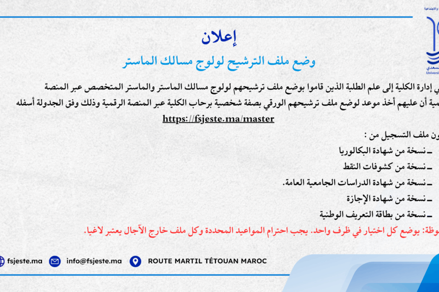 ACTUALITÉS وضع ملف الترشيح لولوج مسالك الماستر https://fsjeste.ma/masterLamrani NaoualNovember 11, 2025