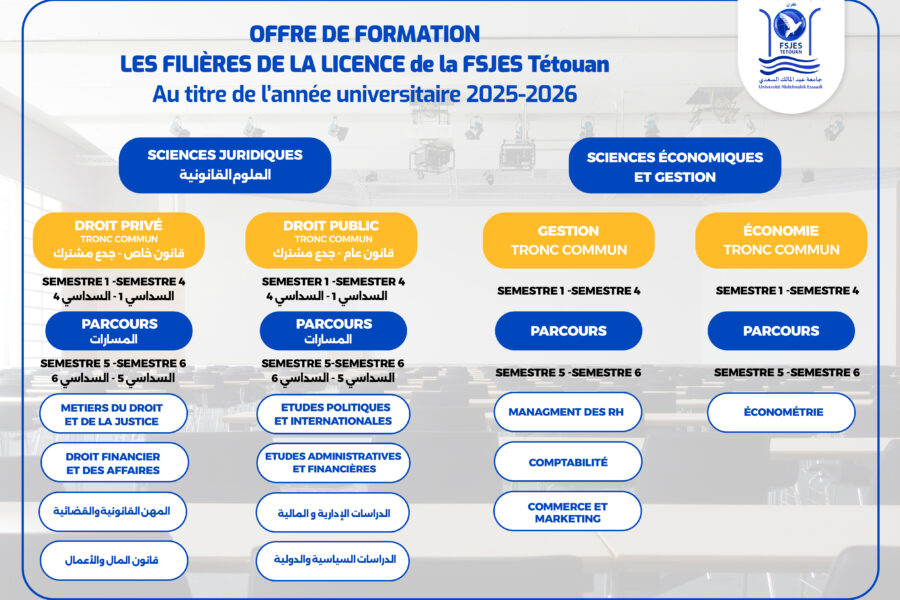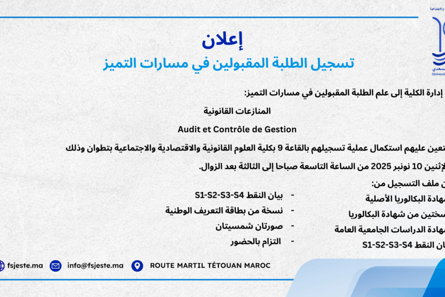 ACTUALITÉS إعلان : لائحة المقبولين لولوج مسار التميز 2025/2026 لائحة المترشحين المقبولين بصفة نهائية لولوج مسار إجازة التميز في المنازعات القانونية Liste des admis…Lamrani NaoualNovember 5, 2025