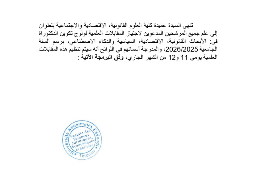 ACTUALITÉS لائحة إضافية خاصة بالمترشحين المدعوين لاجتياز المقابلة العلمية لولوج تكوين الدكتوراة مختبر الدراسات القانونية والدولية وحكامة السياسات العموميةadminNovember 10, 2025