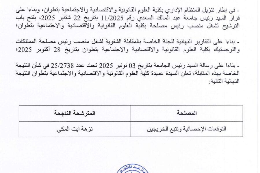 ACTUALITÉSRecrutement النتيجة النهائية لمباراة شغل منصب رئيس مصلحة التوقعات الاحصائية وتتبع الخريجين Lamrani NaoualNovember 4, 2025